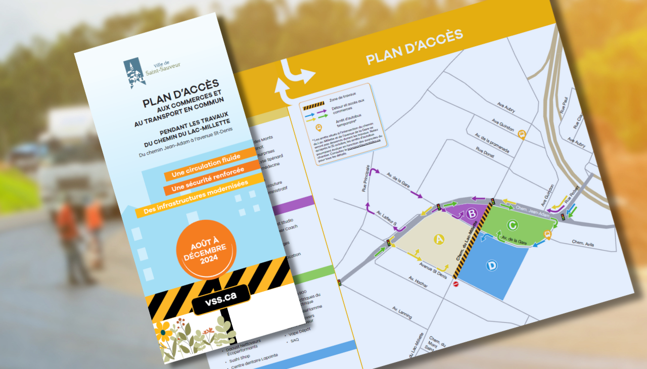 Sensible aux enjeux de circulation causés par les travaux effectués sur le chemin du Lac-Millette et aux impacts ressentis par les commerces environnants, la Ville diffuse un dépliant démontrant les détours à suivre pour accéder aux différents commerces situés entre le chemin Jean-Adam, l’avenue Saint-Denis et l’avenue de la Gare.