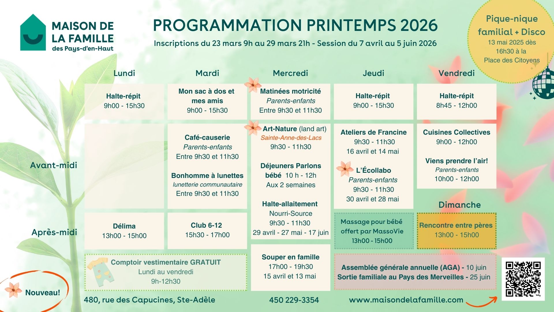 La programmation Printemps 2026 de la Maison de la famille des Pays-d'en-Haut est enfin arrivée! Inscrivez-vous à compter du 23 mars, 9 h.